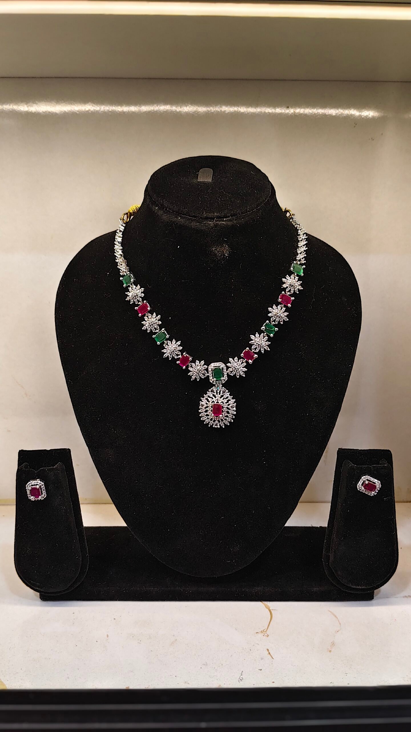 sparkling diamond CZ necklace set with green and ruby stones